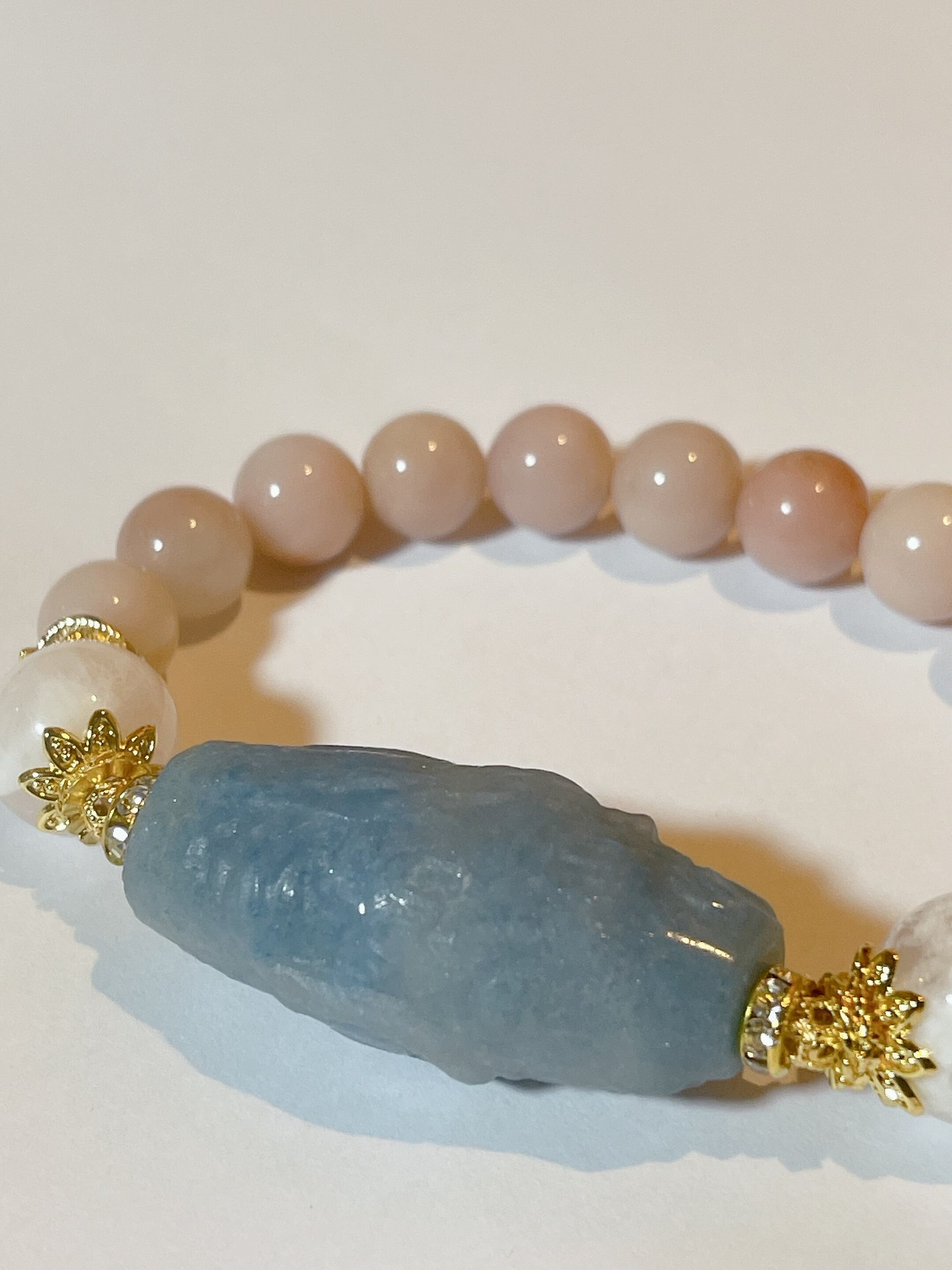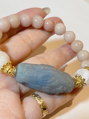 『セリサイト』セリサイトは「美の女神」という異名を持ち、ファンデーションの原材料として用いられているパワーストーンです。 癒しの力を持ち、心身のバランスを整えてくれるといわれています。 セリサイトインローズクォーツはストレスを受けつつも頑張っている方にお勧めです。